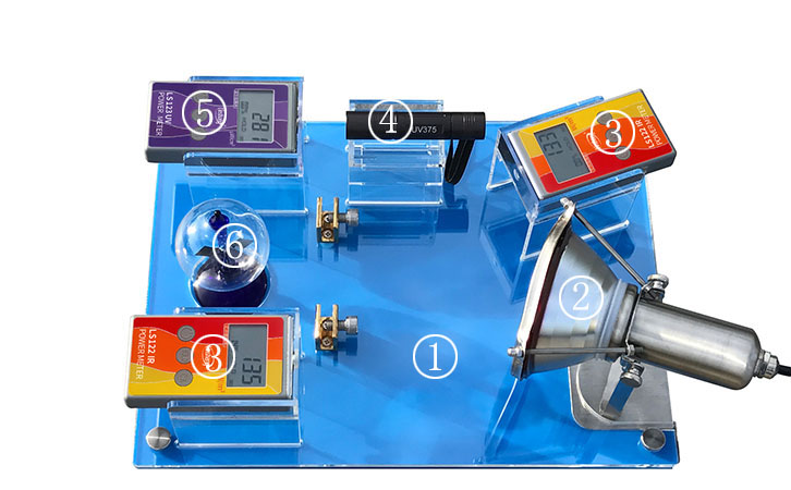 FS2150太陽膜反射測試儀用于展示太陽膜、隔熱玻璃等材料對光線的反射及阻隔效果。紅外線燈對面的LS122紅外功率計(jì)用于測試太陽膜,隔熱玻璃等的紅外線阻隔率,即隔熱效果;同側(cè)的LS122紅外功率計(jì)用于測試太陽膜,隔熱玻璃等的光反射能力大小;LS123紫外功率計(jì)測試太陽膜,隔熱玻璃等的隔紫外能力。光強(qiáng)魔鏡用于生動(dòng)演示隔熱效果,光強(qiáng)魔鏡的葉片旋轉(zhuǎn)速度和光線的強(qiáng)度成正比。