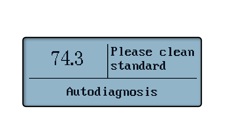 1、開機儀器會自校準,當檢測標準板不在合格范圍,會顯示以下英文,提示清潔標準板,要用儀器標配的鏡頭布來清潔,如用其他清潔布會劃傷標準板影響測量結果。然后把主機扣入底座。