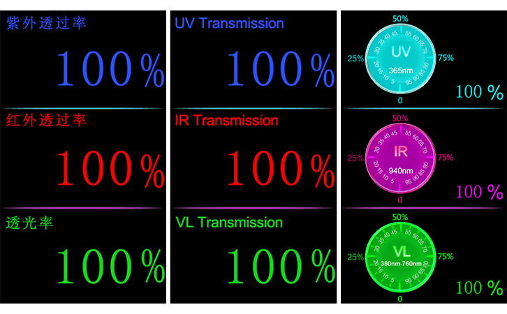 儀器可同時檢測三個參數紫外透過率,紅外透過率,可見光透過率,其中可見光采用全波段白光,加入CIE明視覺函數,確保通過權威計量院的檢測。因此,LS183可用于檢測涂料,玻璃,鍍膜材料,有機材料,太陽膜等的光學透過率測試。