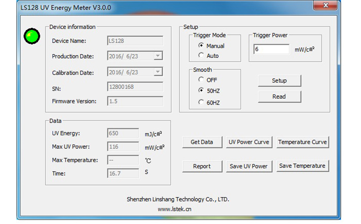 LS128和LS120曝光機能量檢測儀的下方還有USB接口,可連接電腦安裝儀器軟件,儀器軟件安裝完后,即可連接電腦讀取儀器的測試數據。軟件具有參數配置,數據讀取,紫外功率曲線,溫度曲線,導出紫外功率/溫度數據到EXCEL表格等功能。