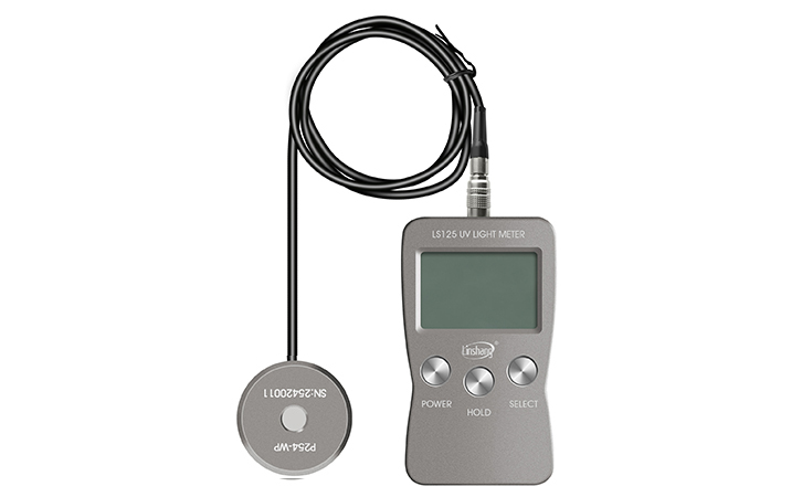 LS125+P254-WP紫外輻射照度計采用的是防水的數字探頭,其防水的深度可達1m,功率最大可測200000 uW/cm2,儀器采用插拔式設計,并且探頭背附磁力可吸附在鐵板上,方便固定。為了防止其他光線的干擾,我們將信號放大的部分放入探測器的金屬盒里還使用了帶補正濾光鏡的專用檢測探頭。儀器可保存9組測量數據,且關機后數據依然保存。
