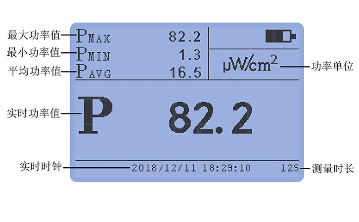3.智能統(tǒng)計功能:測試時儀器會顯示測量功率的單位,最大值,最小值,平均值以及實時值,在屏幕的最下方還能顯示測量時長與日期。